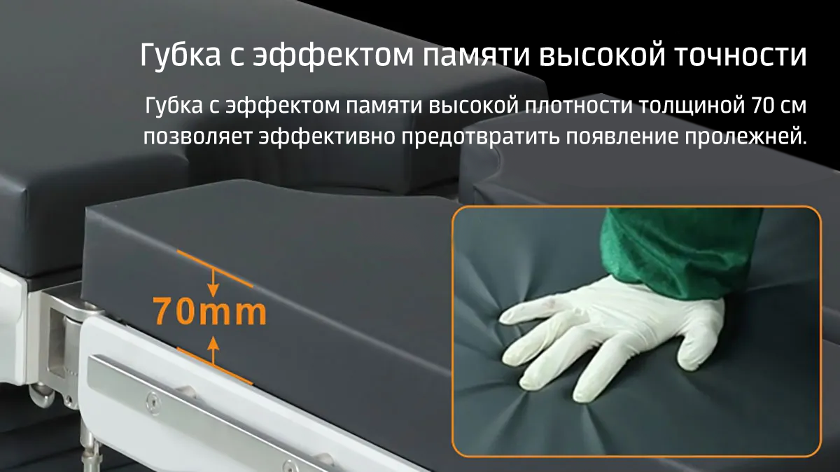 Матрас из пены с эффектом памяти Матрас толщиной 70 мм из нового материала — пены с эффектом памяти. Оптимальная комбинация 30 мм пены с эффектом памяти и 40 мм высокоплотной пены снимает давление, вызванное контактом между телом пациента и поверхностью стола во время длительной операции.