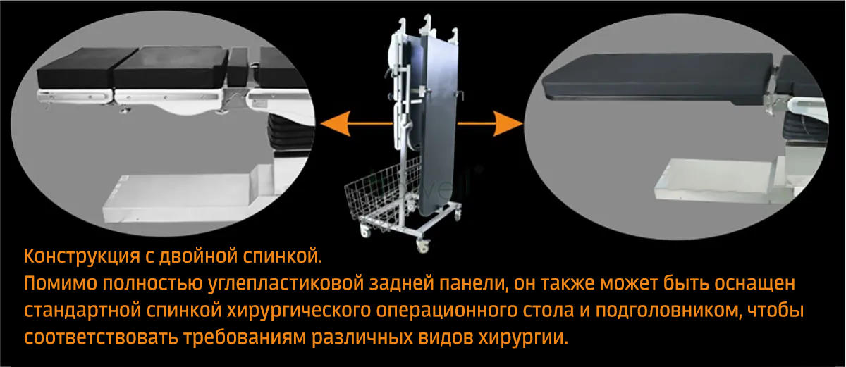 Конструкция с двойной спинной пластиной: помимо полной спинной пластины из углеродного волокна, стол также может быть оснащён стандартной спинной пластиной и головной пластиной хирургического операционного стола для удовлетворения потребностей всех типов хирургических вмешательств.