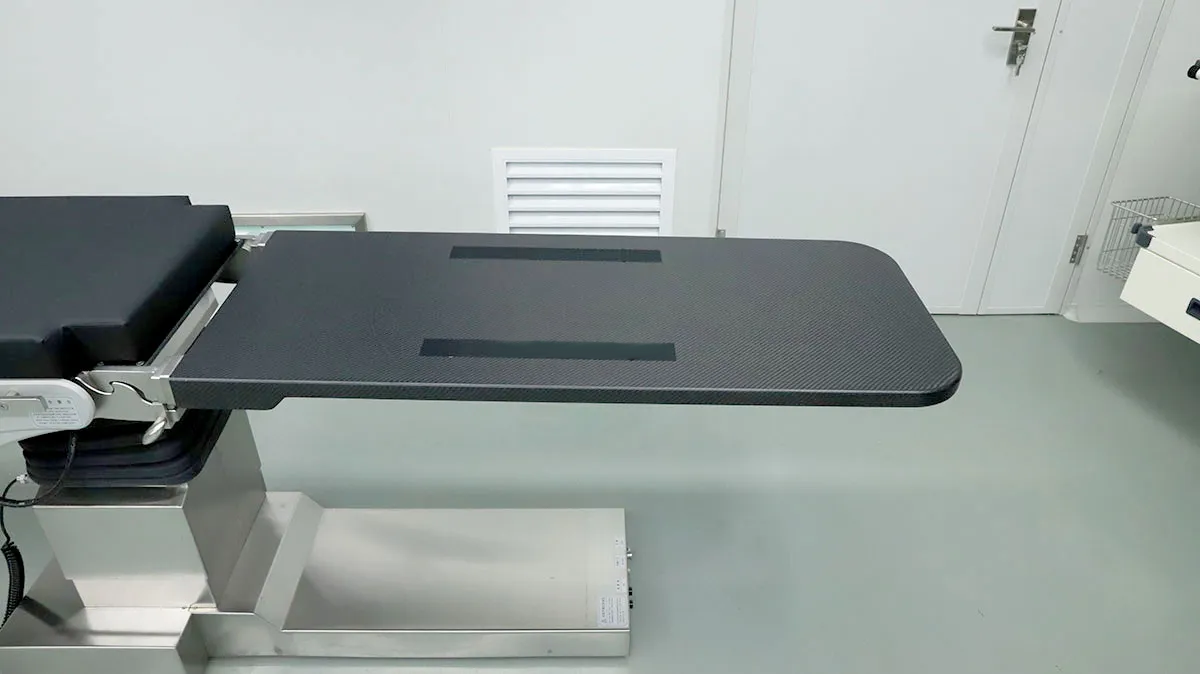 Столешница из углеродного волокна Вся столешница изготовлена из углеродного волокна с низким коэффициентом поглощения рентгеновского излучения и эффектом высокой чёткости просвечивающей визуализации, что значительно снижает радиационное повреждение пациентов и медицинского персонала рентгеновскими лучами.