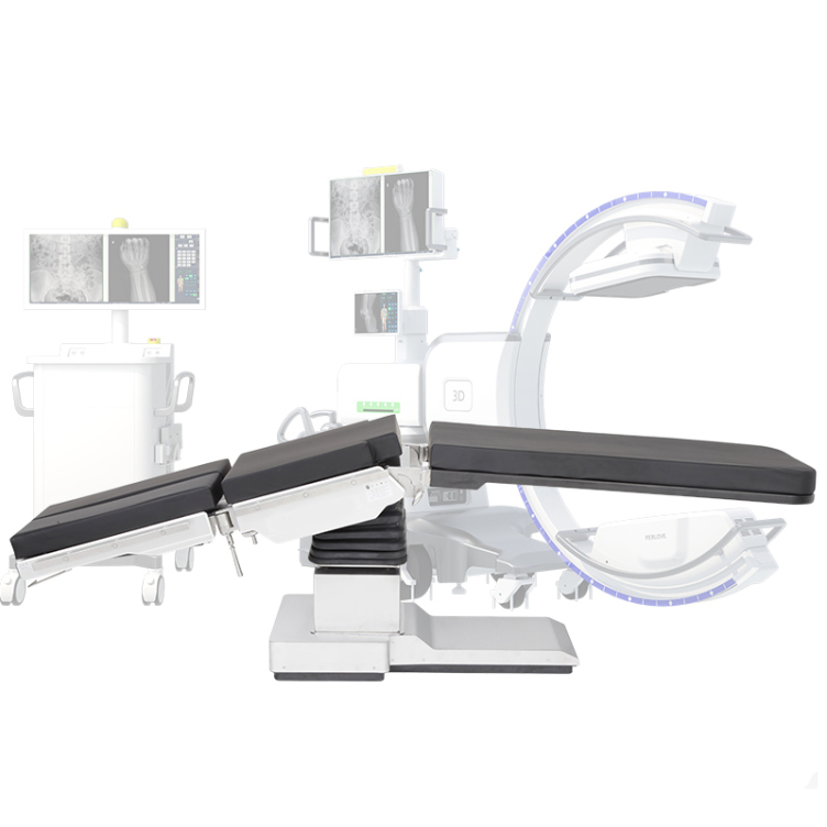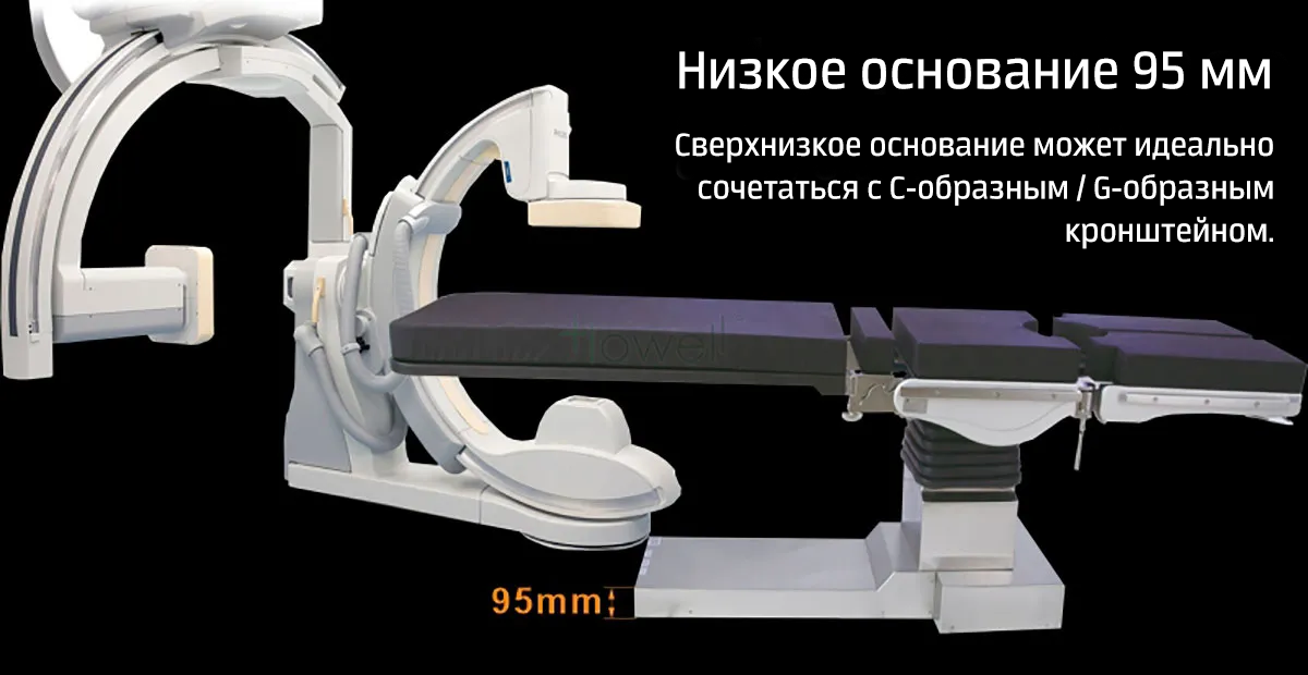 Т-образная конструкция основания ИТ-образная конструкция обеспечивает отличное пространство для ног хирургической бригады, а также имеет стабильный центр тяжести. Высота опорной плиты 95 мм идеально совместима с рентгеновским аппаратом G-Arm.