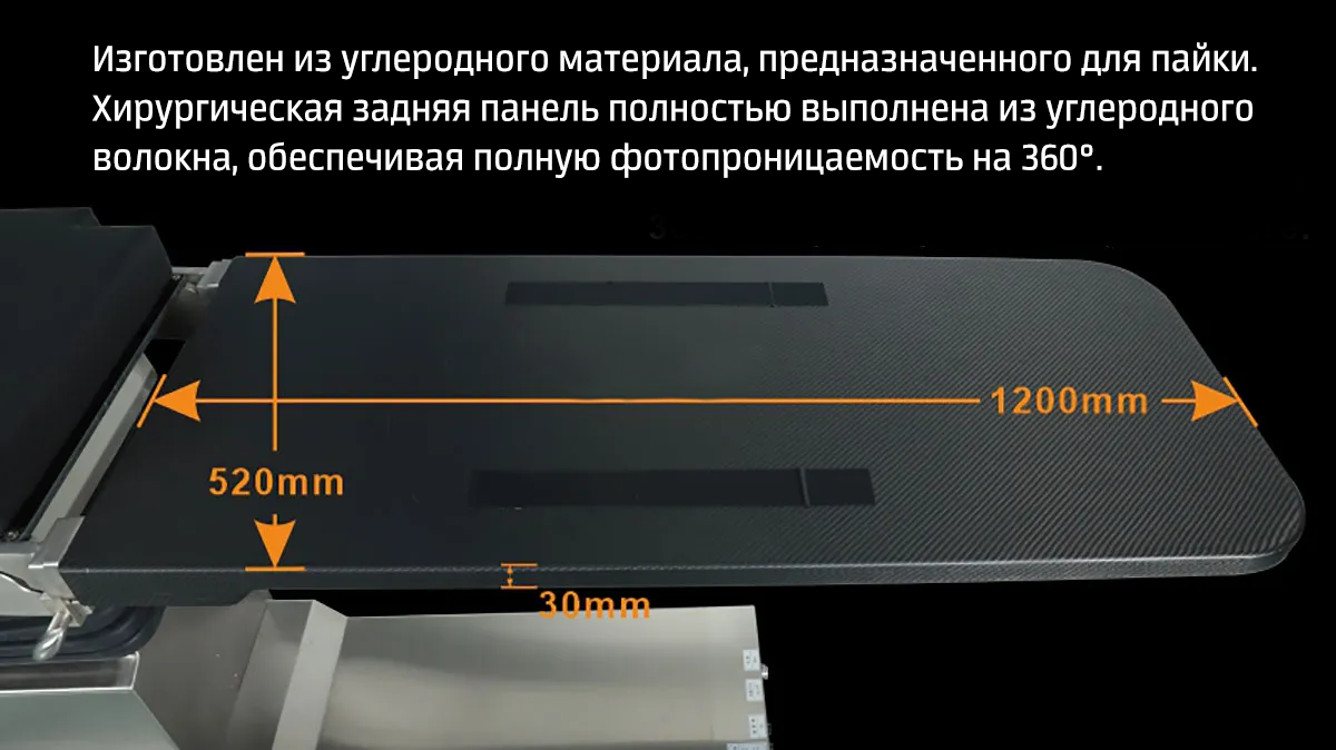 Панель стола из углеродного волокна Панель стола изготовлена из материалов на основе углеродного волокна, имеет низкую поглощающую способность рентгеновского излучения и высокую чёткость рентгеновского изображения, что снижает радиационное воздействие рентгеновских лучей на пациентов и медицинский персонал.