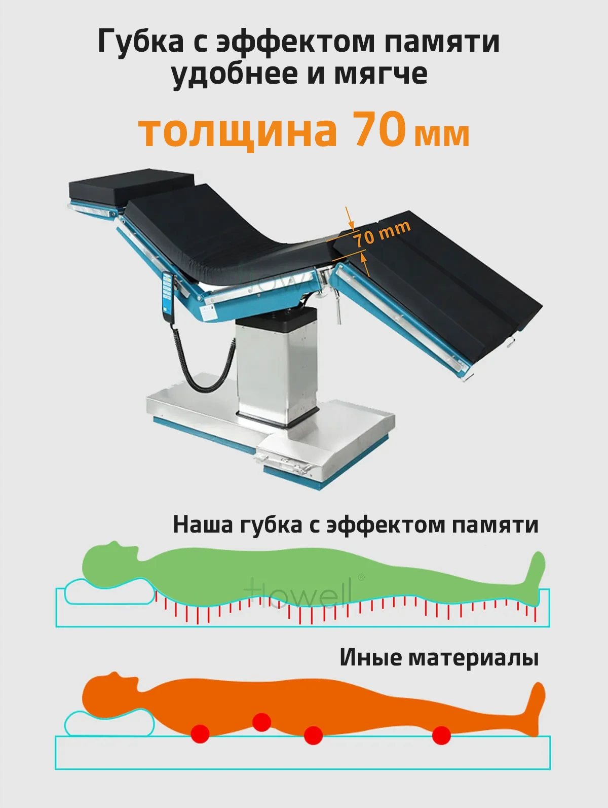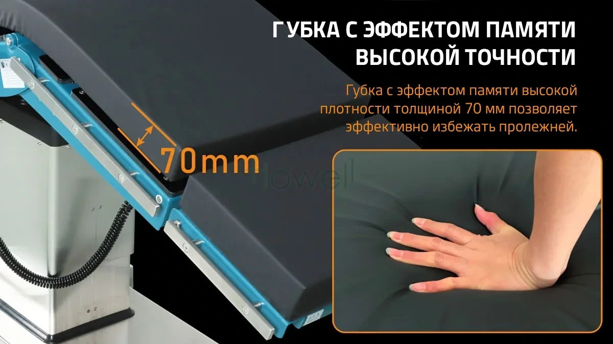 Матрас из двухслойной пены с эффектом памяти Матрас толщиной 80 мм из двухслойной пены с эффектом памяти равномерно распределяет вес пациента по всей подушке, снижает риск пролежней во время операции, а поверхность матраса бесшовная, антибактериальная и лёгкая в очистке.
